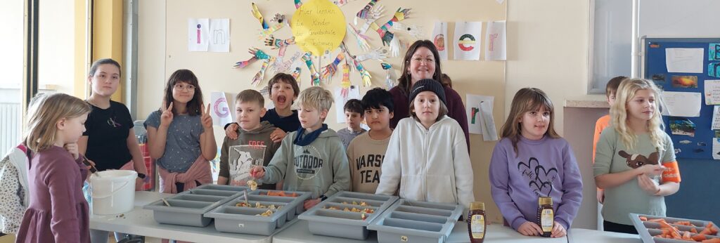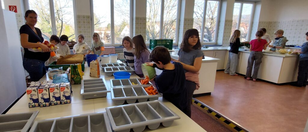 Am 3.März 2026 bereitete die Klasse 3b das Müslifrühstück vor. Es wurde gewaschen, geschnippelt, in Schalen verteilt und das Buffet vorbereitet.