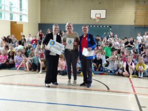 Martin Langner (Fachberater Schulsport beim Regionalen Landesamt für Schule und Bildung für den Landkreis Northeim) überreichte Anja Lachmann (Schulleitung) und Daniela Gebel (Fachkonferenzleitung Sport) die Urkunde und das Schild „Sportfreundliche Schule“.